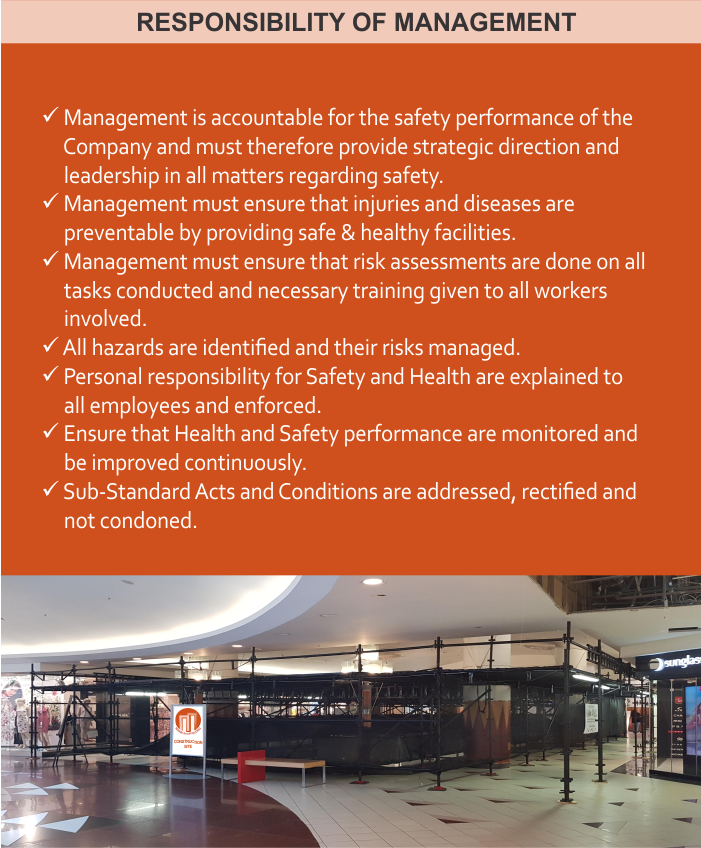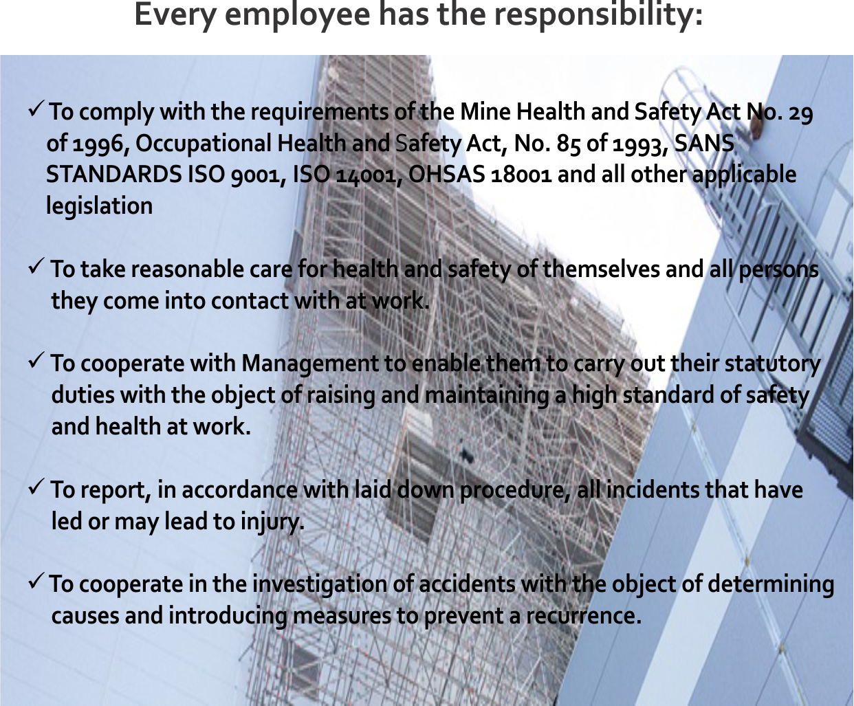 We strive to promote the health and safety within our operations as an essential part of our responsibilities. We regard the promotion of health and safety matters as a mutual objective of every manager and employee. It is our policy to use our Safety Management System to do all that is reasonable and practical to prevent personal injury, damage to property and to protect all interested and affected parties from foreseeable work hazards, financial and economic implications insofar as they come into contact with the operations of Moabi Scaffolding.